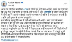 उत्तराखंड:-पूर्व मुख्यमंत्री हरीश रावत को सीबीआई ने फिर भेजा नोटिस……
