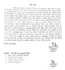 तहसीलदार हल्द्वानी कुलदीप पाण्डे ने अवगत कराया कि तहसीलदार कार्यालय हल्द्वानी में दिनांक 27 जनवरी 2026 को खुली बोली के माध्यम से नीलामी का आयोजन किया गया। जिसमें परियोजना प्रबन्धक ब्रिडकुल की बकाया धनराशि मु. 3,01,03,000.00 जमा न करने पर बकायेदार धनंजय गिरी पुत्र जटाशंकर गिरी निवासी सुभाष नगर हल्द्वानी के नाम की अचल सम्पत्ति ग्राम मल्ली बमौरी तहसील हल्द्वानी के हाल खतौनी खाता संख्या संख्या-11 के खसरा संख्या 217 मि. रकबा 0.030 है. भूमि को परगना अधिकारी/असिस्टैन्ट कलैक्टर प्रथम श्रेणी हल्द्वानी के ज०वि० आकार पत्र 74 (नियम 282) के आदेश दिनांक 26.12.2025 जारी कर 30 दिवस के पश्चात् नीलामी तिथि दिनाँक 27. 01.2026 नियत की गयी। जिसमें तहसीलदार हल्द्वानी को नीलामी अधिकारी नामित किया गया। नीलामी में कुल 09 बोलीदाताओ के द्वारा प्रतिभाग किया गया। बोली के दौरान दो प्रतिभागी बोली के समय नीलामी स्थल पर उपस्थित नहीं हुए। नीलामी कार्यवाही के दौरान तीसरे चक्र में सर्वोच्च बोली मु० 1,16,50000.00 (एक करोड सोलह लाख पचास हजार रू.) खीमानन्द सनवाल पुत्र हीराबल्लम सनवाल निवासी पंत पार्क सुभाष नगर हल्द्वानी के द्वारा लगाई गयी। 1.16,50000.00रु. से ऊपर अन्य किसी भी बोलीदाता द्वारा बोली न लगाये जाने के कारण खीमानन्द सनवाल पुत्र हीराबल्लभ सनवाल नि० पत पार्क सुभाषनगर हल्द्वानी के पक्ष में नीलामी की संस्तुत्ति की गयी। सर्वोच्च बोली का 25 प्रतिशत धनराशि का भुगतान बोलीदाता द्वारा चैक के माध्यम से नीलामी स्थल पर किया गया। जिसका पत्र नीलामी के 30 दिवस पश्चात् विक्रय पत्र सर्वोच्च बोलीदाता के पक्ष में किया जायेगा।