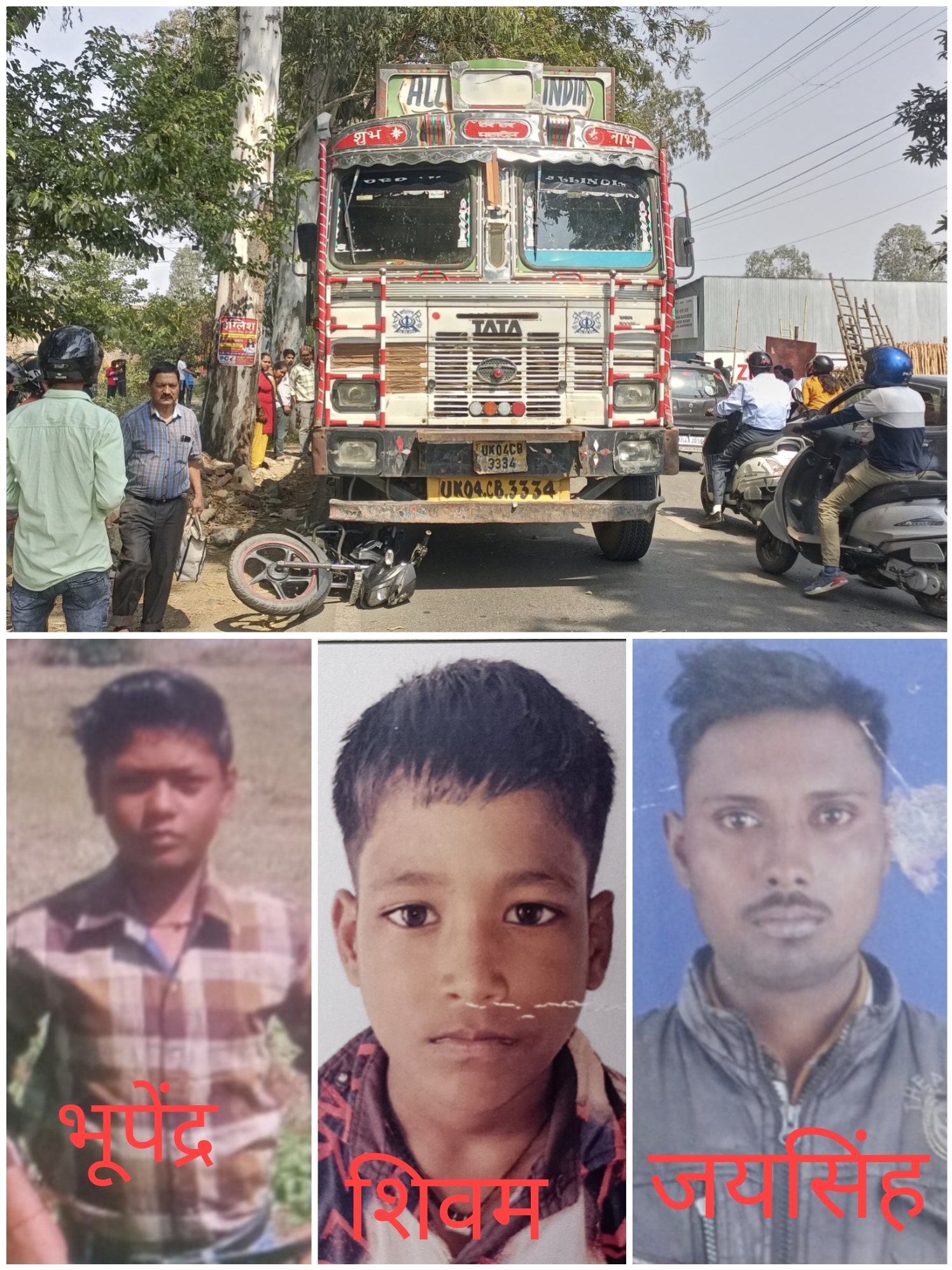 हल्द्वानी: कमलुवागांजा रोड पर हुए भीषण सड़क हादसे में बाइक सवार तीन लोगों की दर्दनाक मौत हो गई है। प्राप्त जानकारी के अनुसार आज मंगलवार को कमलूवागाजा रोड पर तेज रफ्तार 12 टायर ट्रक ने मोटरसाइकिल सवारों को टक्कर मार दी। हादसे में एक व्यक्ति की मौके पर ही मौत हो गई, जबकि दो अन्य गंभीर रूप से घायल हो गए।स्थानीय लोगों ने घायलों को नजदीकी अस्पताल में पहुंचाया जहां इलाज के दौरान उनकी भी मौत हो गई। घटना की सूचना मिलते ही पुलिस मौके पर पहुंची और ट्रक को कब्जे में ले लिया। पुलिस ने मृतकों के शव को पोस्टमार्टम के लिए भेज दिया है। प्रत्यक्षदर्शियों के अनुसार, ट्रक तेज रफ्तार में था, जिससे ड्राइवर वाहन पर नियंत्रण खो बैठा और यह हादसा हो गया। जानकारी के अनुसार मूल रूप से बरेली मनकापुर हाल निवासी हरिपुर नायक जय सिंह उम्र 40 वर्ष बाइक से पुत्र भूपेंद्र मौर्य उम्र 12 वर्ष और उसके साथी शिवम उम्र 12 वर्ष पुत्र राम लड़ैत हाल निवासी जयदेवपुर आरटीओ रोड पोस्ट ऑफिस हरिपुर नायक हल्द्वानी को लेकर बाजार जा रहे थे तभी बेकाबू ट्रक ने बाइक को पीछे से जोरदार टक्कर मार दी। जिससे जय सिंह की मौके पर ही मौत हो गई, जबकि भूपेंद्र और शिवम गंभीर रूप से घायल हो गए। लोगों ने घायल बच्चों को निजी अस्पताल में भर्ती कराया लेकिन कुछ देर बाद दोनों की मौत हो गई। जय सिंह हरिपुर नायक में एक पोल्ट्री फार्म में देख रेख का कार्य करता था। यहां वह अपनी पत्नी, बेटे भूपेंद्र और बेटी के साथ रहता था। वहीं मृतक शिवम के पिता भी मजदूरी करते हैं। चार बहन भाइयों में शिवम दूसरे नंबर का था। भूपेंद्र और शिवम छड़ेयल स्थित सरकारी स्कूल में कक्षा 8 के छात्र थे। तीन मौतों से दोनों ही परिवारों में मातम का माहौल है। लगातार बढ़ रहे सड़क हादसों से लोग दहशत में हैं।