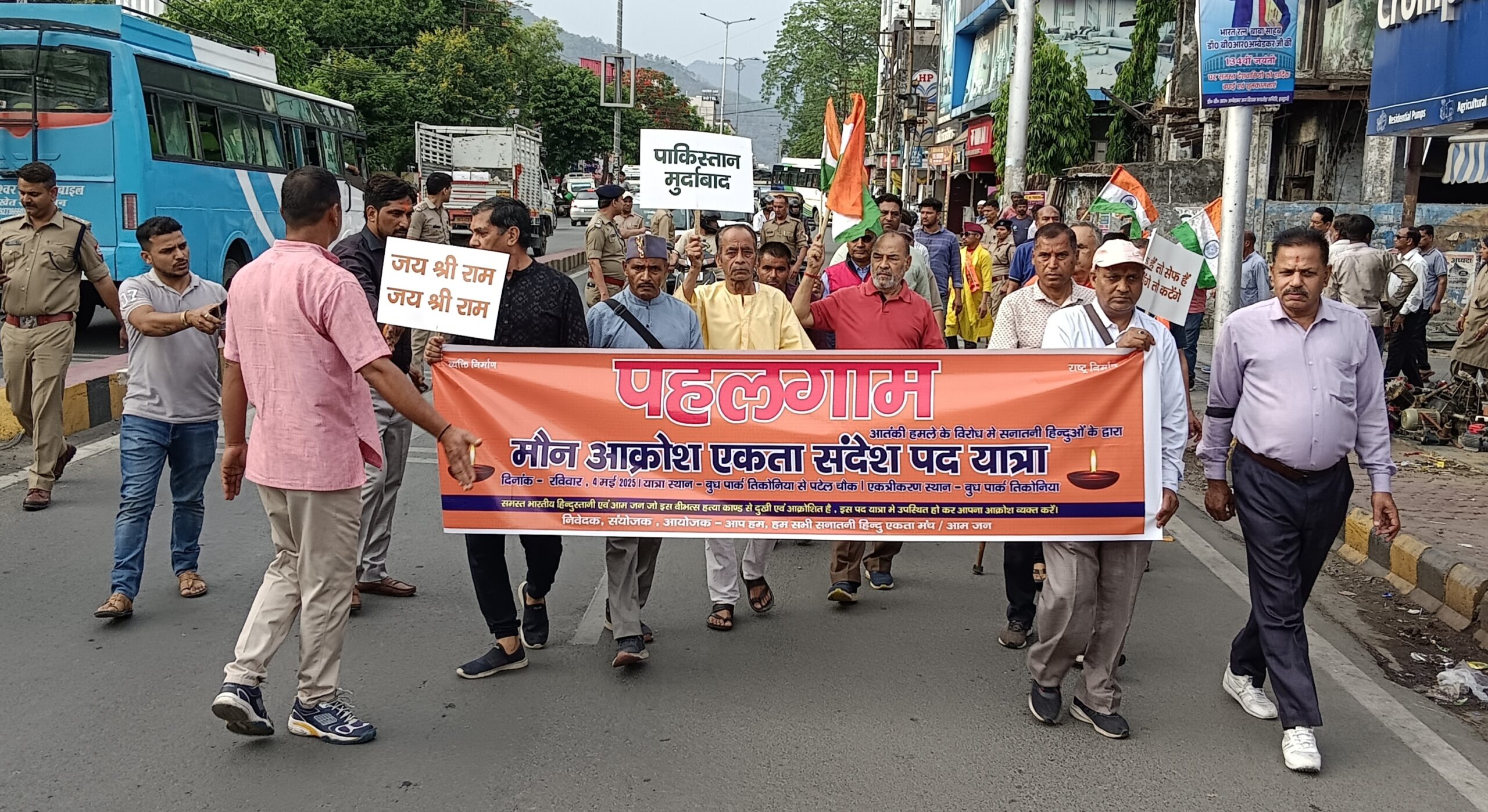 हल्द्वानी। पहलगाम आतंकी हमले के खिलाफ जनता में रोष थमने का नाम नहीं ले रहा है। रविवार को इसके खिलाफ हिंदू एकता मंच के तत्वाधान में मौन आक्रोश एकता संदेश पद यात्रा गई। बुद्ध पार्क से शुरू होकर यात्रा मुख्य मार्ग से होते हुए पटेल चौक स्थित बेलवाल पार्क में सामुहिक हनुमान चालिसा का पाठ किए जाने के बाद यात्रा का समापन हुआ। यात्रा में बुजुर्ग, महिलाओं, युवाओं और बच्चों सहित 200 से अधिक लोग शामिल रहे। इस दौरान प्रशासनिक अधिकारियों के साथ साथ भरी संख्या में पुलिस मौजूद रही। यात्रा के दौरान गिरीश चंद्र, जीवन विष्ट, दिनेश फूलारा, तन्मय पांडे, चंदन विष्ट, रविंद्र सिंह, सचिन शाह, मनोज तिवारी, कमला विष्ट, हरिप्रिया पांडे, उमेश मौर्य, कमला बिष्ट, हेमेंद्र रावत, गोविंद बिष्ट, जानकी कांडपाल, नवीन चंद्र पांडे, गणेश भट्ट सहित सैकड़ो लोग मौजूद रहे।