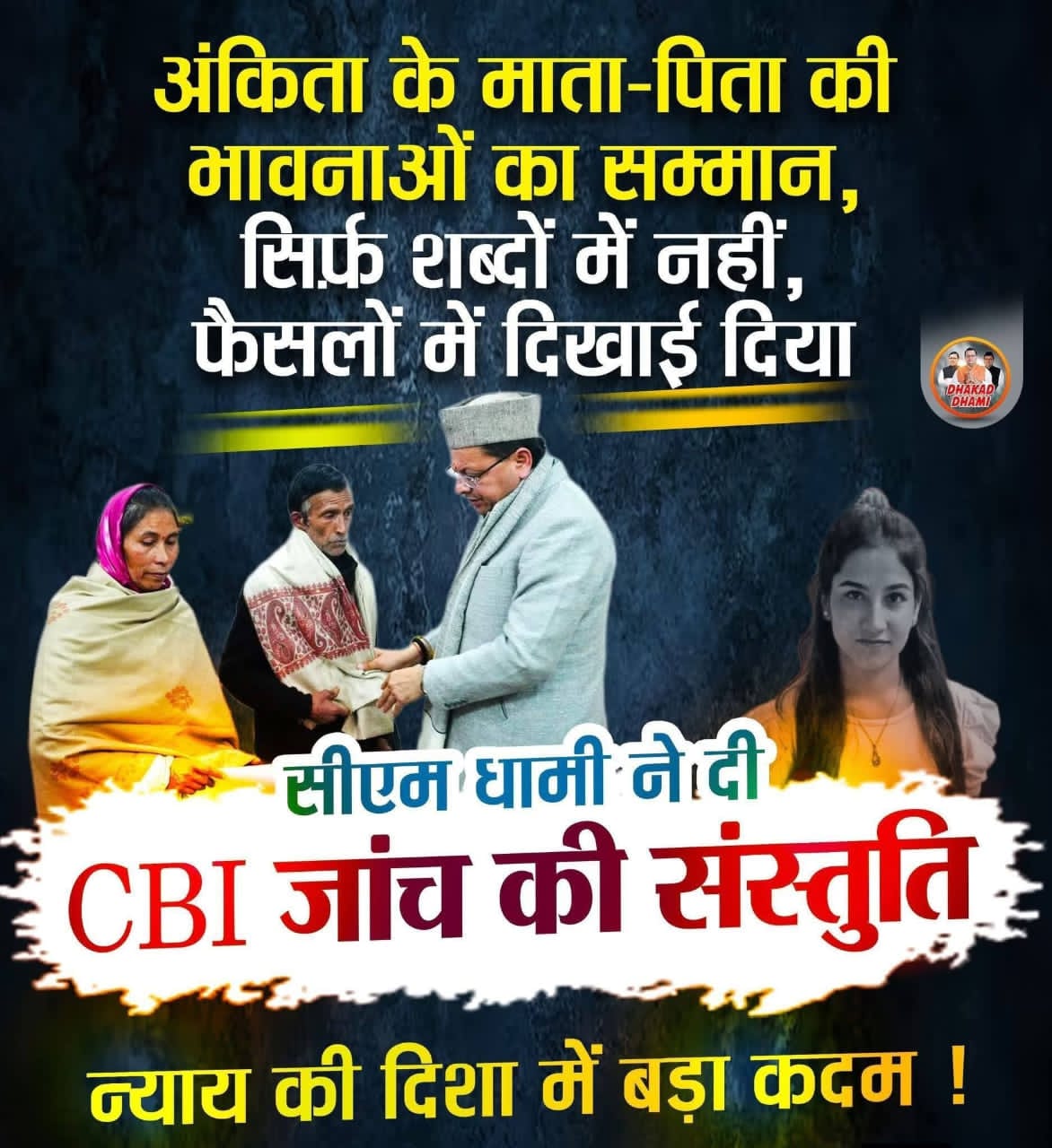 कल्पना ने कहा कि अंकिता भंडारी जैसे अति संवेदनशील मामले में मुख्यमंत्री धामी ने उनके माता पिता एवं प्रदेश की जनभावनाओं को समझते हुए CBI जाँच के निर्देश दिए, जिसके लिए हम अपने धाकड़ धामी मुख्यमंत्री का धन्यवाद व्यक्त करते हैं।